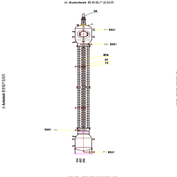 在轉盤式萃取塔內,中間是由旋轉的軸串起的大小、間距相同的多個圓盤,稱為轉盤,隨著軸的旋轉而做勻速轉動。轉盤被固定在塔壁上的大小、間距相同的環形圓盤隔開,稱為定盤。一種溶液(密度較小的)由塔的下部連續進入塔內,由於浮力的作用,向塔的上方流動,被連續旋轉轉盤的離心作用被打碎並分散成液滴,另一種溶劑(密度較大)由塔的上部連續進入塔內,由於重力的作用,向下流動,並充滿全塔,被打散的液滴分散在連續的溶液中,通過液滴與溶劑的接觸,溶液中的一種或幾種組分選擇性地溶解在連續的溶劑中,進行質量傳遞。在填料萃取塔中溶液的破碎是通過填料的作用。轉盤的數量、間距等結構,填料的大小和高度是根據物料的性能和要求分離的程度和純度等因素計算得到的。